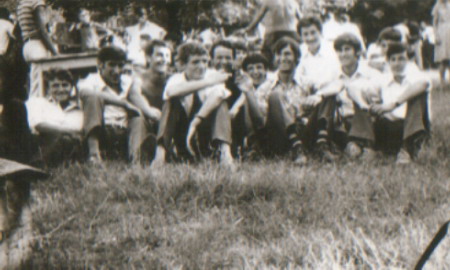 Живота Б. Михајловић (1951.), Зоран А. Савић (1953.), Љубиша Д. Живковић (1948.) и мали Љубиша В. Живковић у „Врањино“ – чувено игралиште, на коме су многе генерације дечака и омладинаца из доње мале играле фудбал (фото 1968.) |