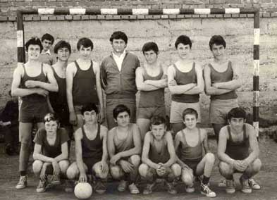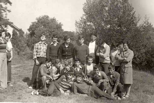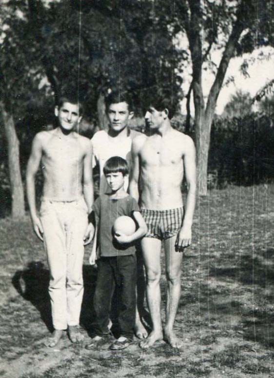 Живота Б. Михајловић (1951.), Зоран А. Савић (1953.), Љубиша Д. Живковић (1948.) и мали Љубиша В. Живковић у „Врањино“ – чувено игралиште, на коме су многе генерације дечака и омладинаца из доње мале играле фудбал (фото 1968.) |