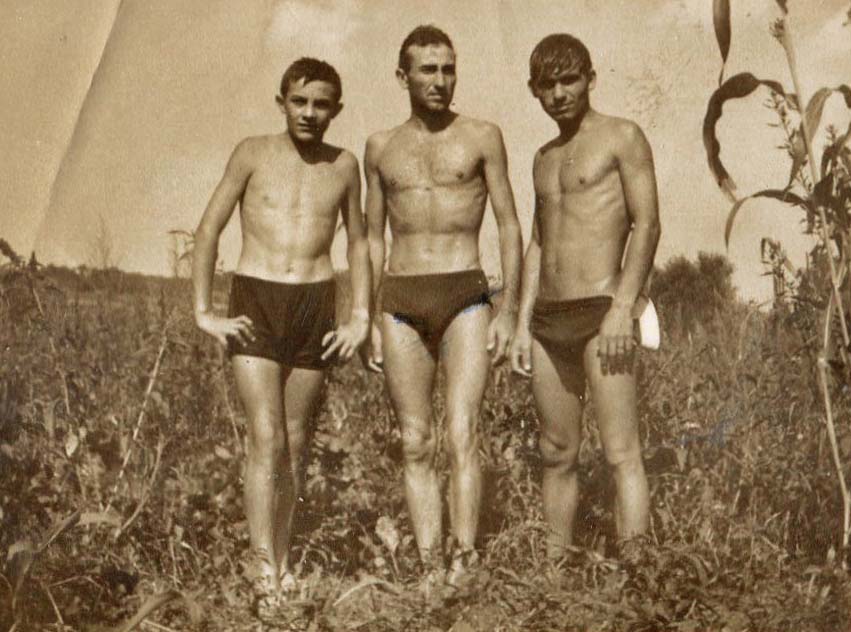 На купалишту „Код кривине“ - Зоран А. Савић (1953.), Јован Д. Савић (1941.) и Боривоје Божиновић (1942.). Тзв. вир ''на кривину'' налазио се на реци, у горњем току, пре одвајања реке на ''појазак'' /за воденицу/ и реку, негде код ''Пајићких градина'' код градине Милета Томиног. Вир је био у кривини и био је најдубљи на реци. На његоој обали постојала је врба са које се скакало у воду. Ту су се купале старије генерације током педесетих и шездесетих година. – фото: 1967. |